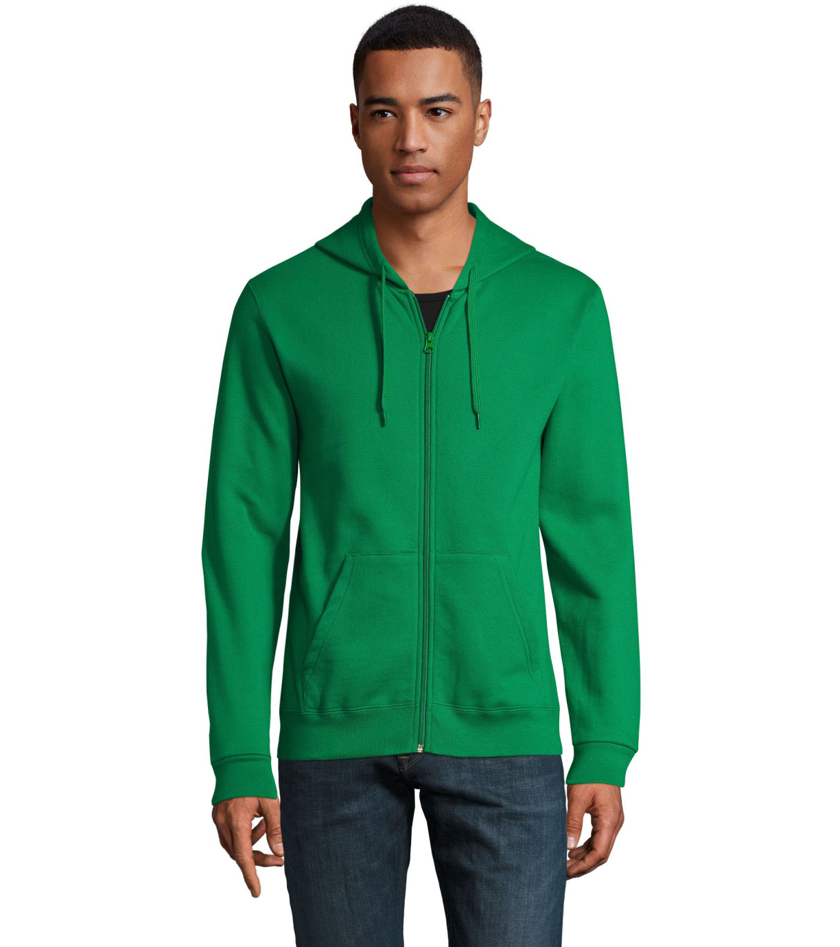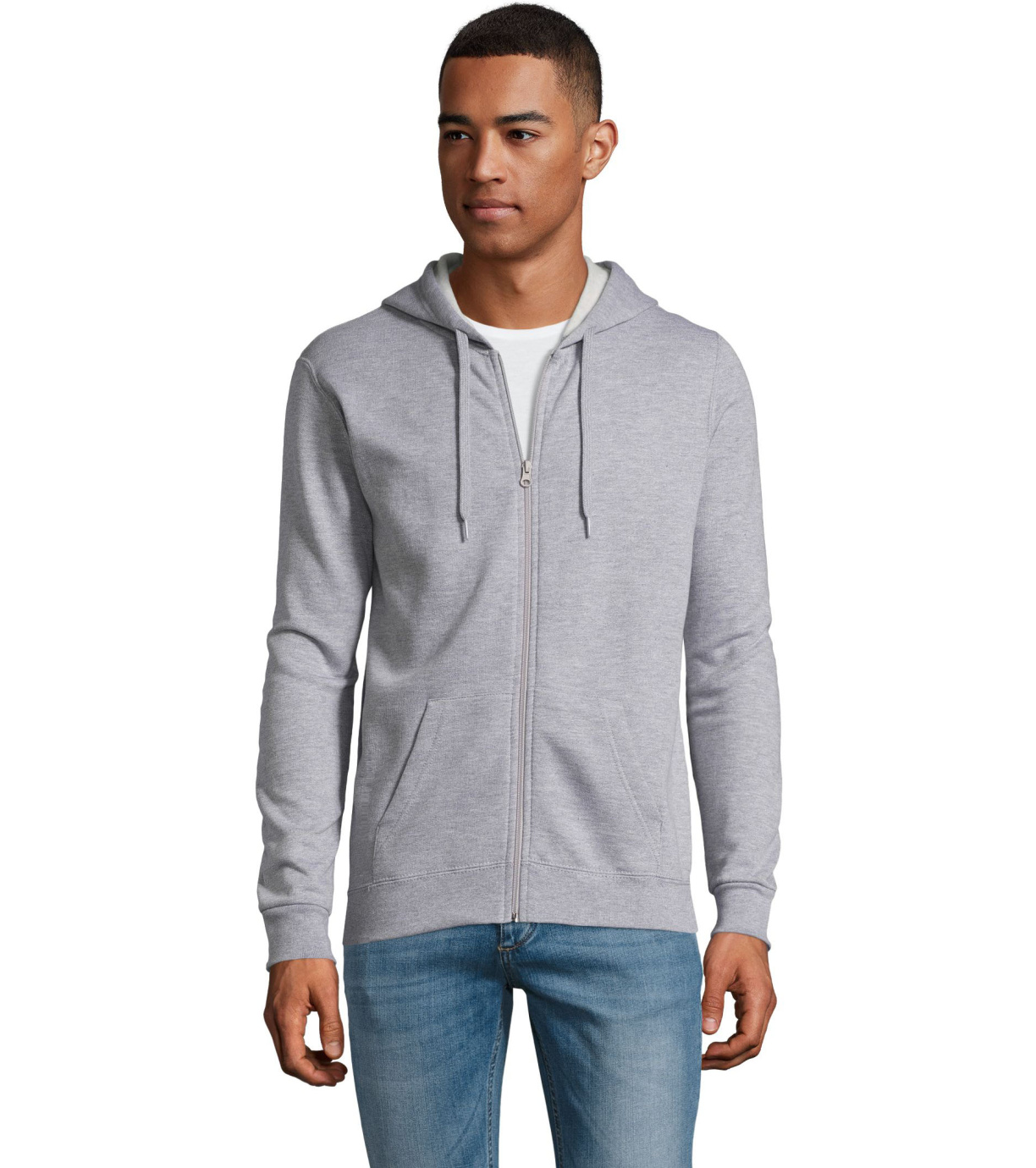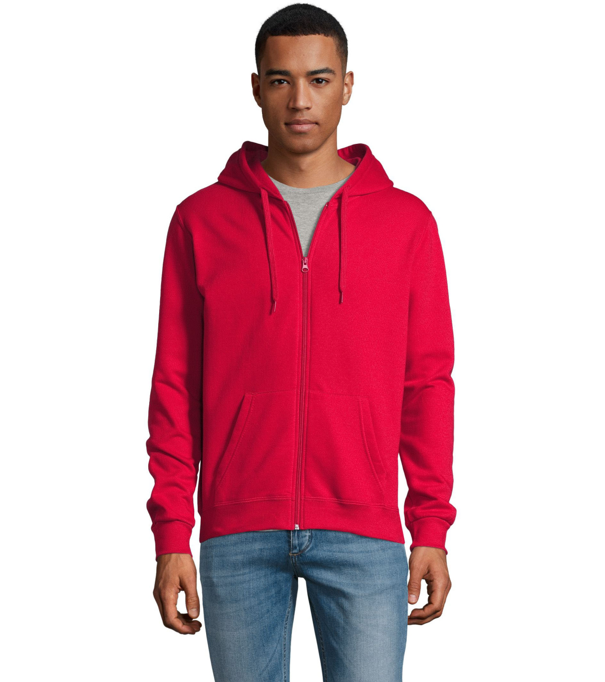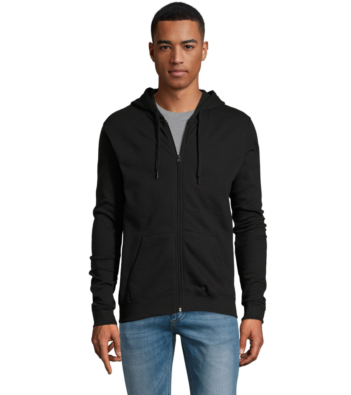 Rozpinana bluza męska. Kaptur ze ściągaczem, prosty krój, kieszeń kangur, elastyczne mankiety.