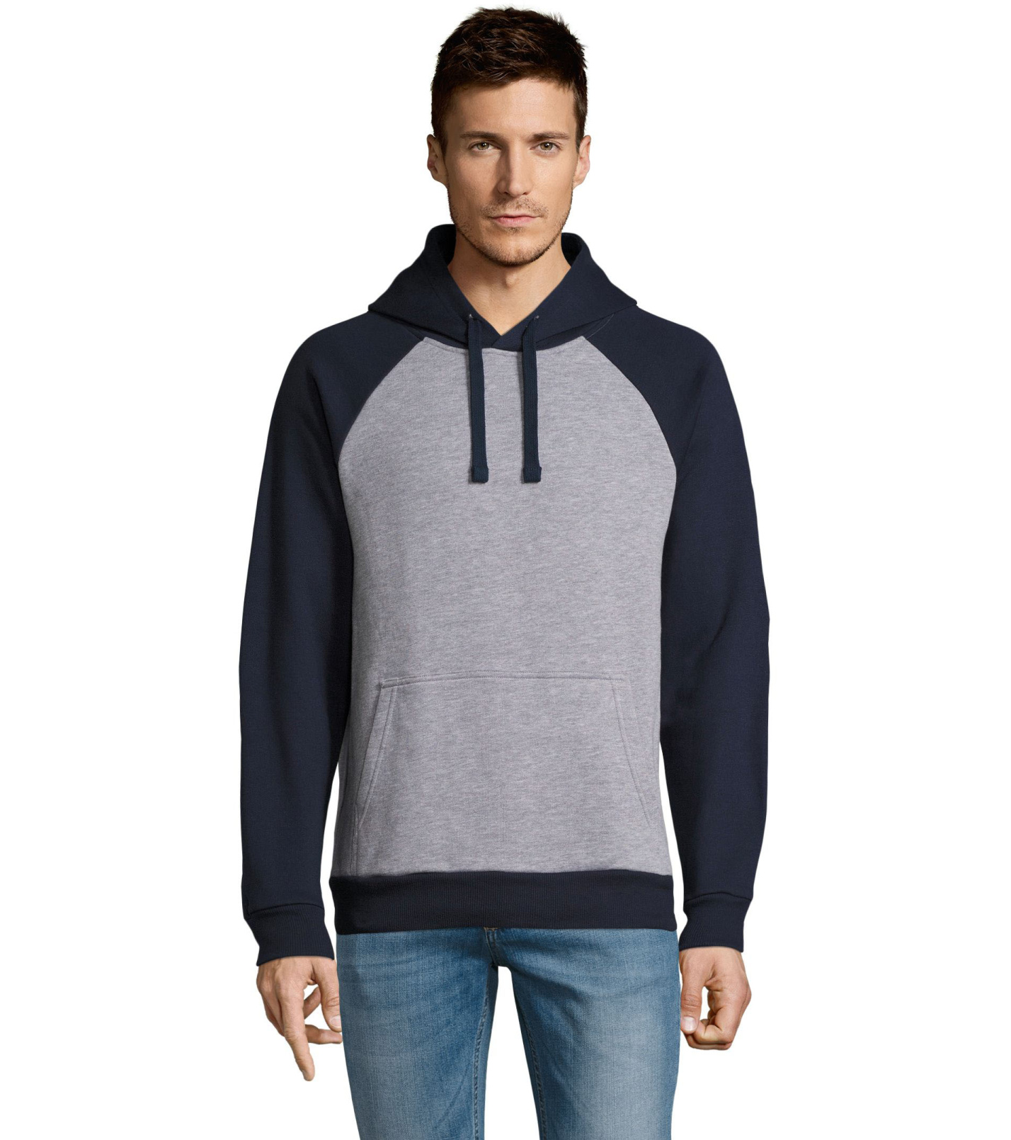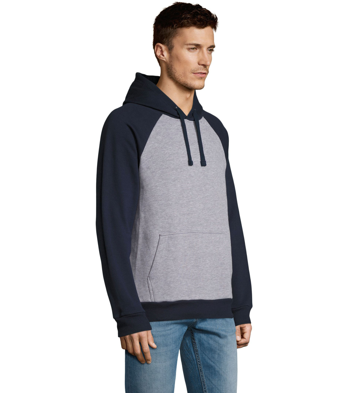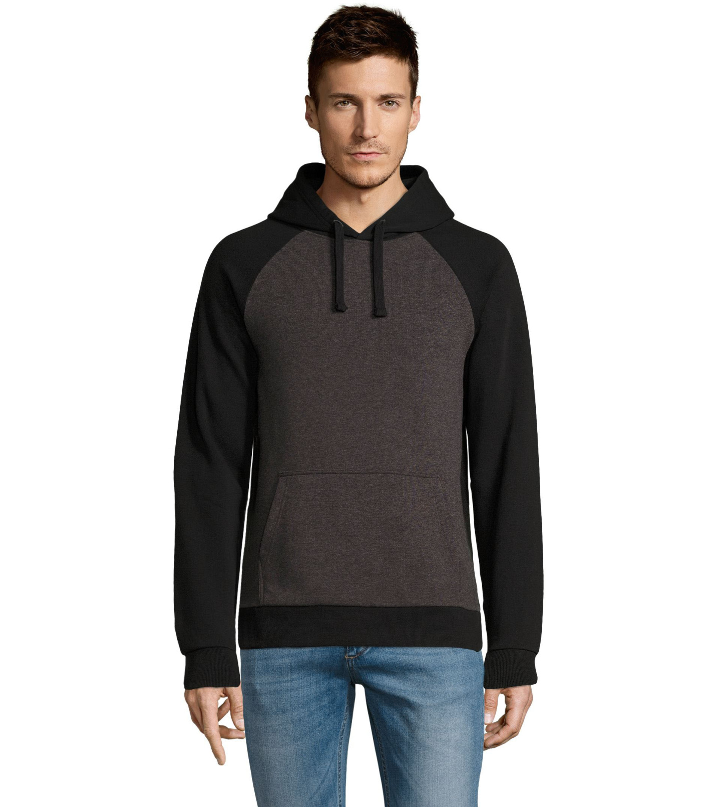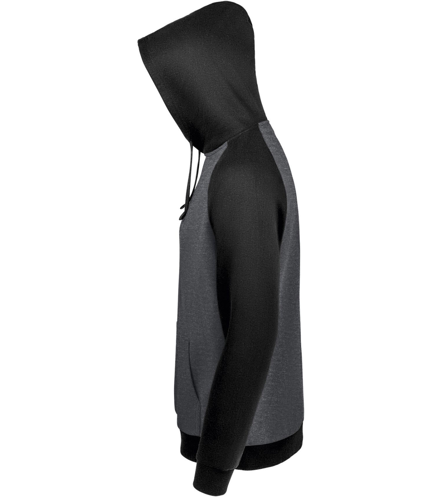 Dwukolorowa bluza unisex z długimi, raglanowymi rękawami. Z przodu znajduje się kieszeń kangurka. Ściągacze u dołu i przy mankietach. Kaptur z podszewką i sznurkiem. Wewnętrzna część kołnierza jest podklejona taśmą.
