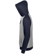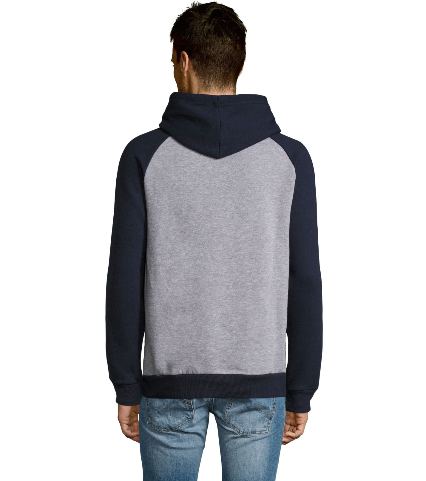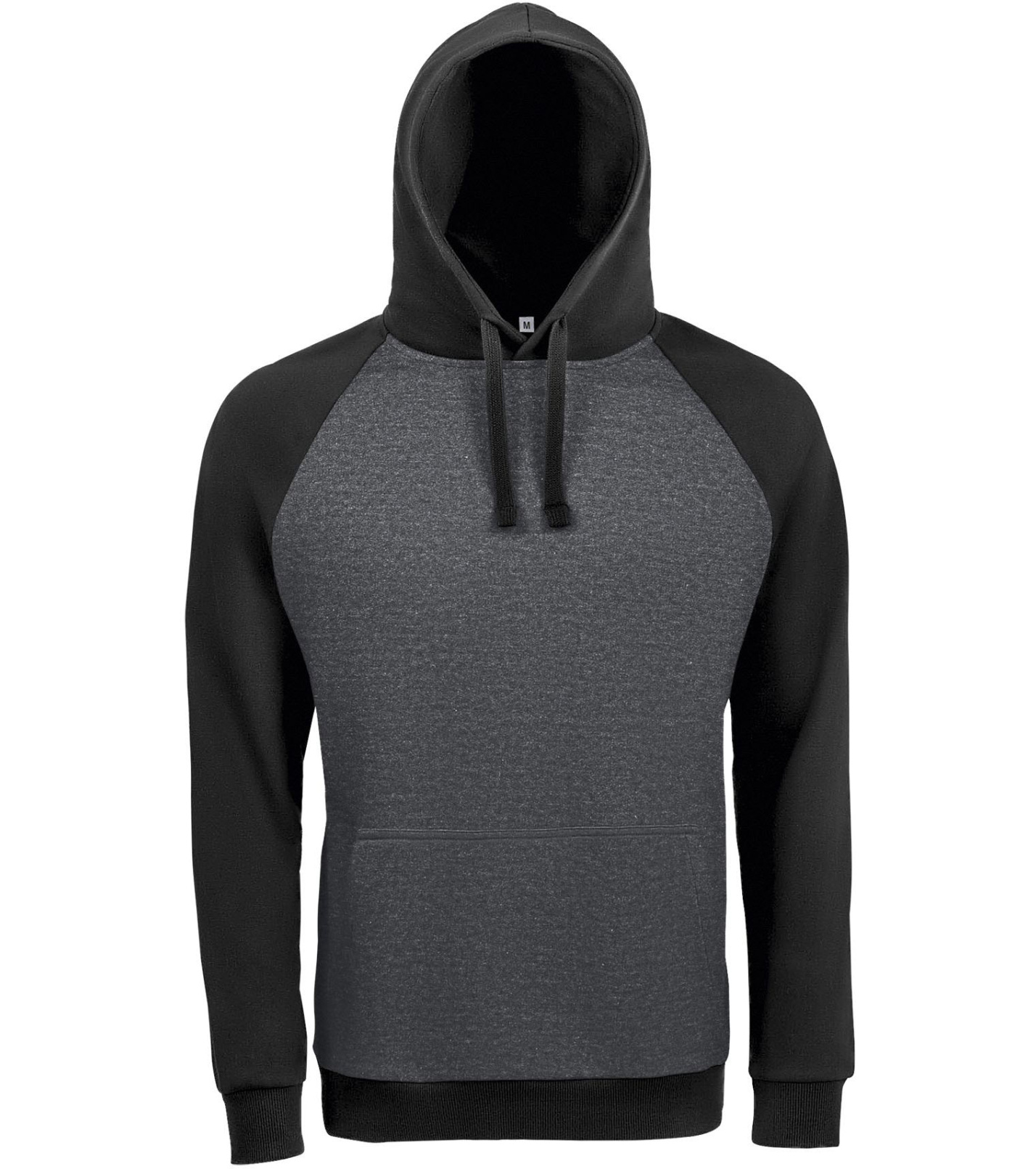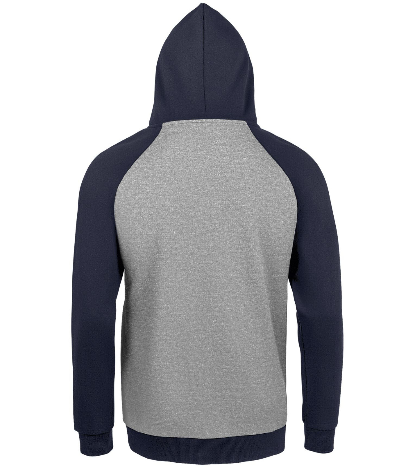 Dwukolorowa bluza unisex z długimi, raglanowymi rękawami. Z przodu znajduje się kieszeń kangurka. Ściągacze u dołu i przy mankietach. Kaptur z podszewką i sznurkiem. Wewnętrzna część kołnierza jest podklejona taśmą.