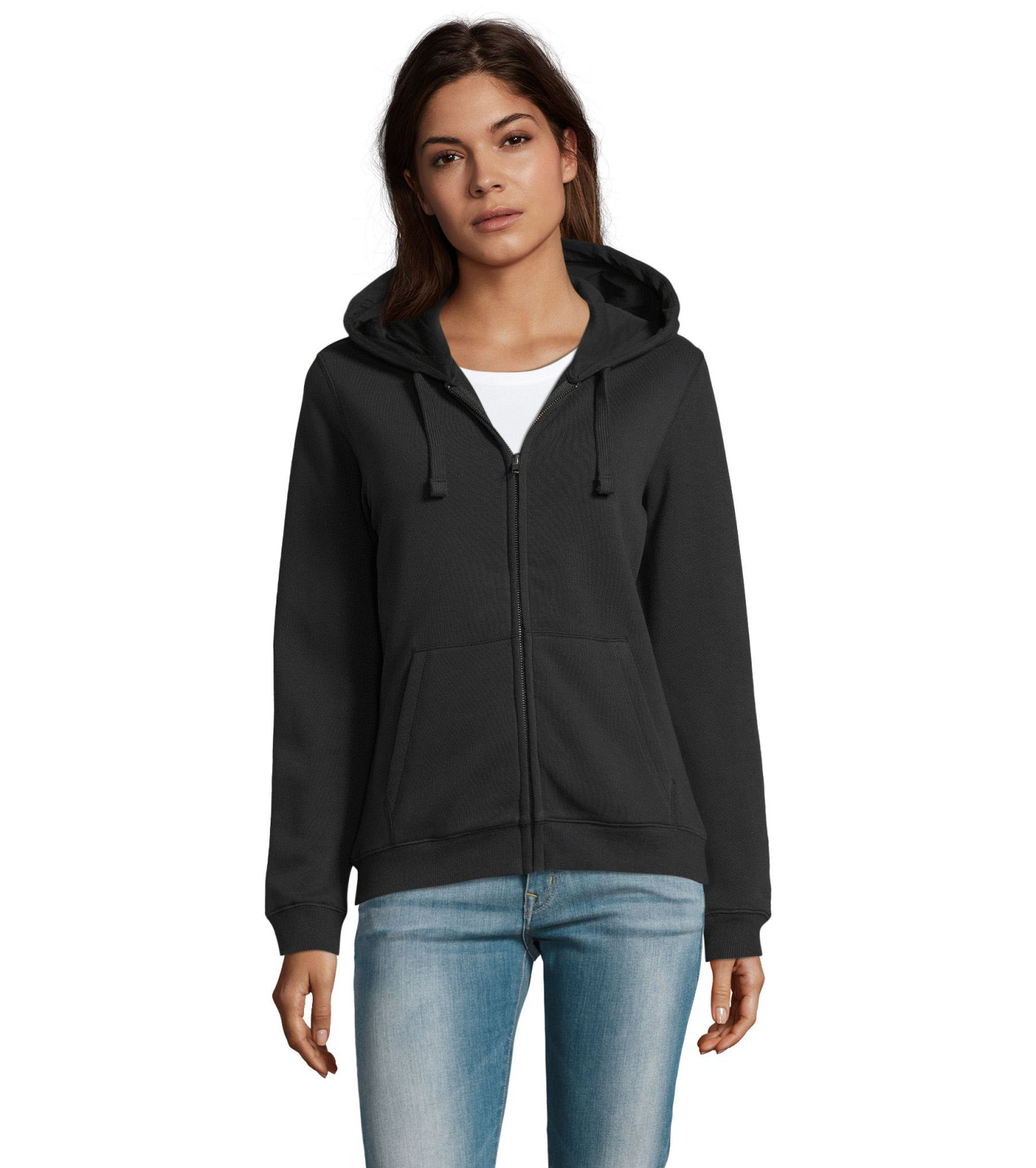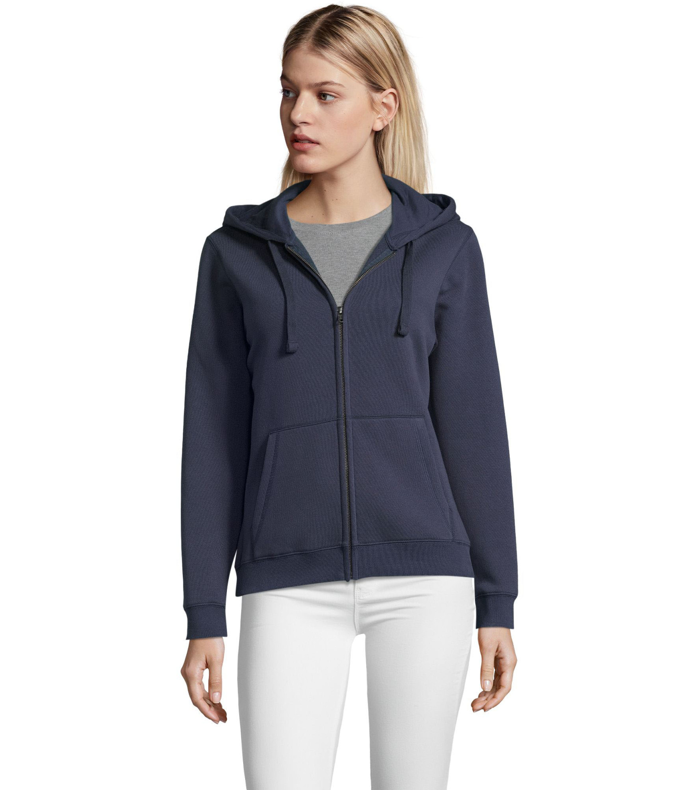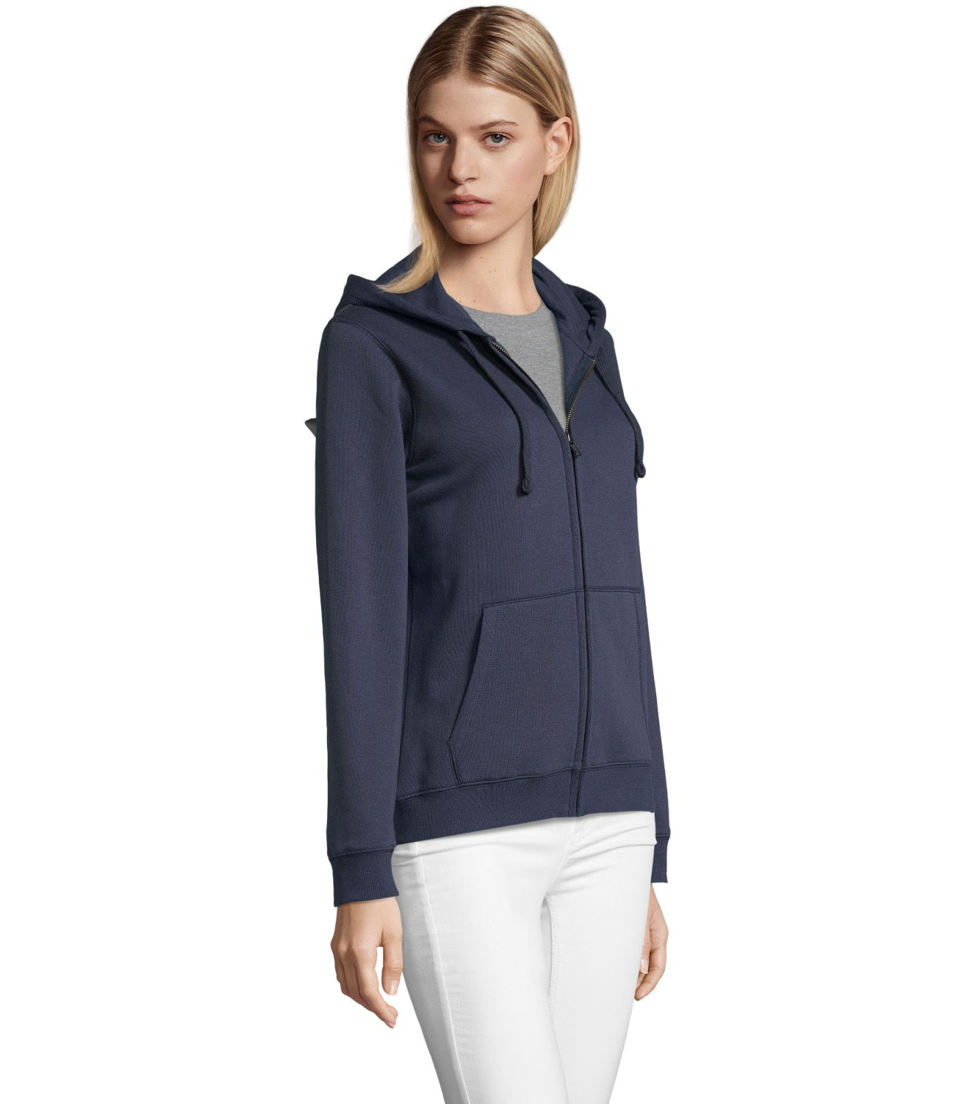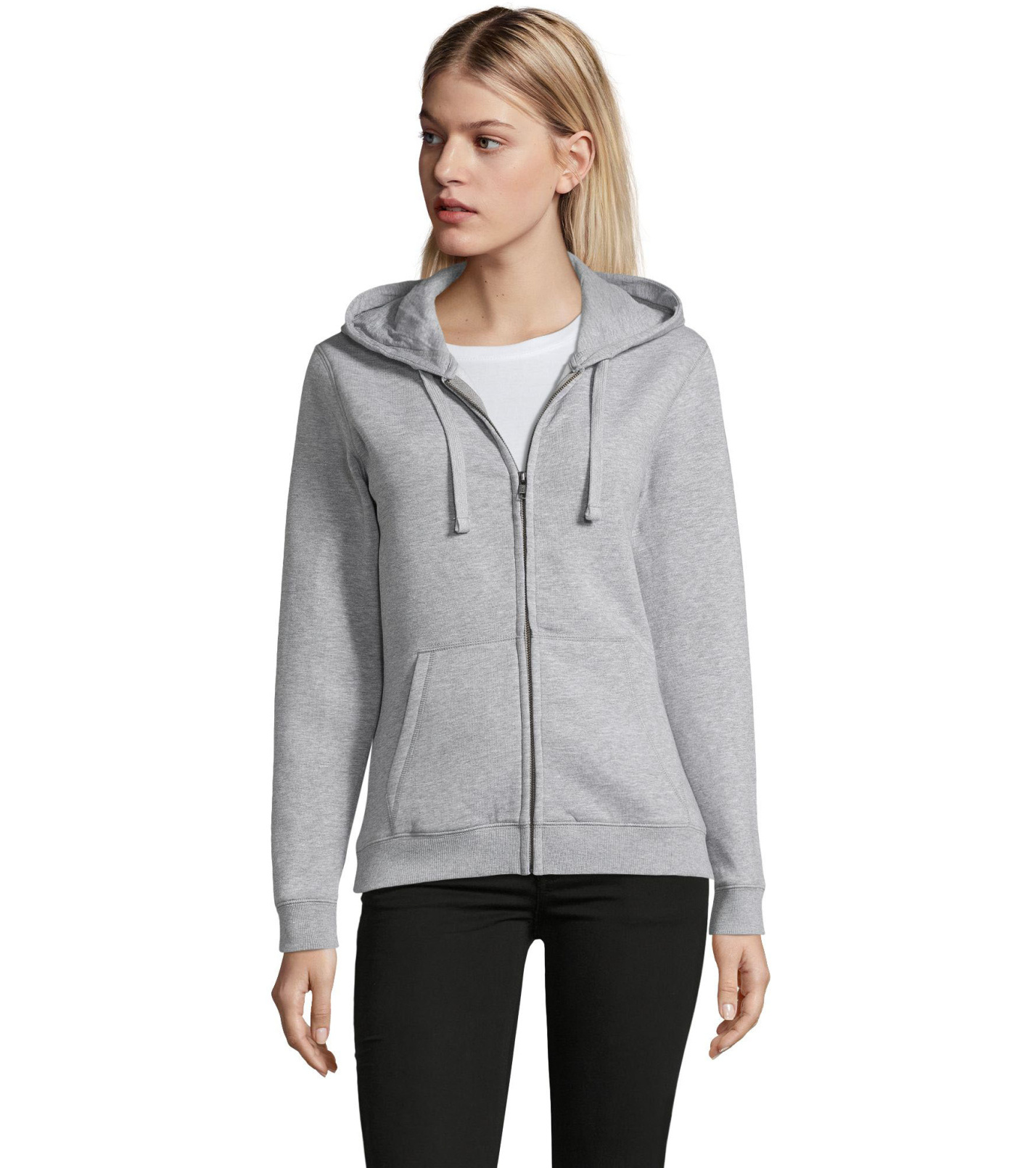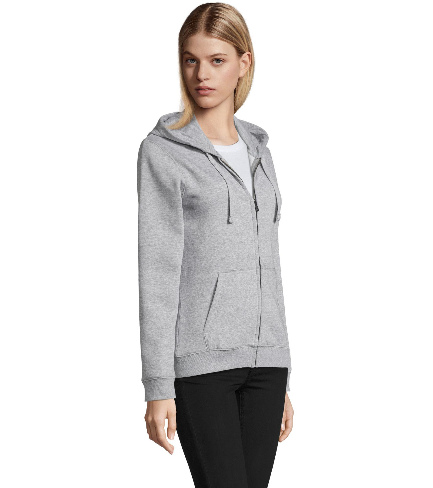Damska bluza zapinana na zamek, z kapturem i bocznymi szwami. Z przodu znajdują się 2 kieszenie kangurki. Kaptur z podszewką i sznurkiem w kolorze materiału. Mankiety rękawów i dół bluzy wykonane są z dzianiny prążkowanej 2x2. Rękawy można regulować za pomocą mankietów. Od wewnętrznej strony wokół szyi wklejka w kształcie półksiężyca.