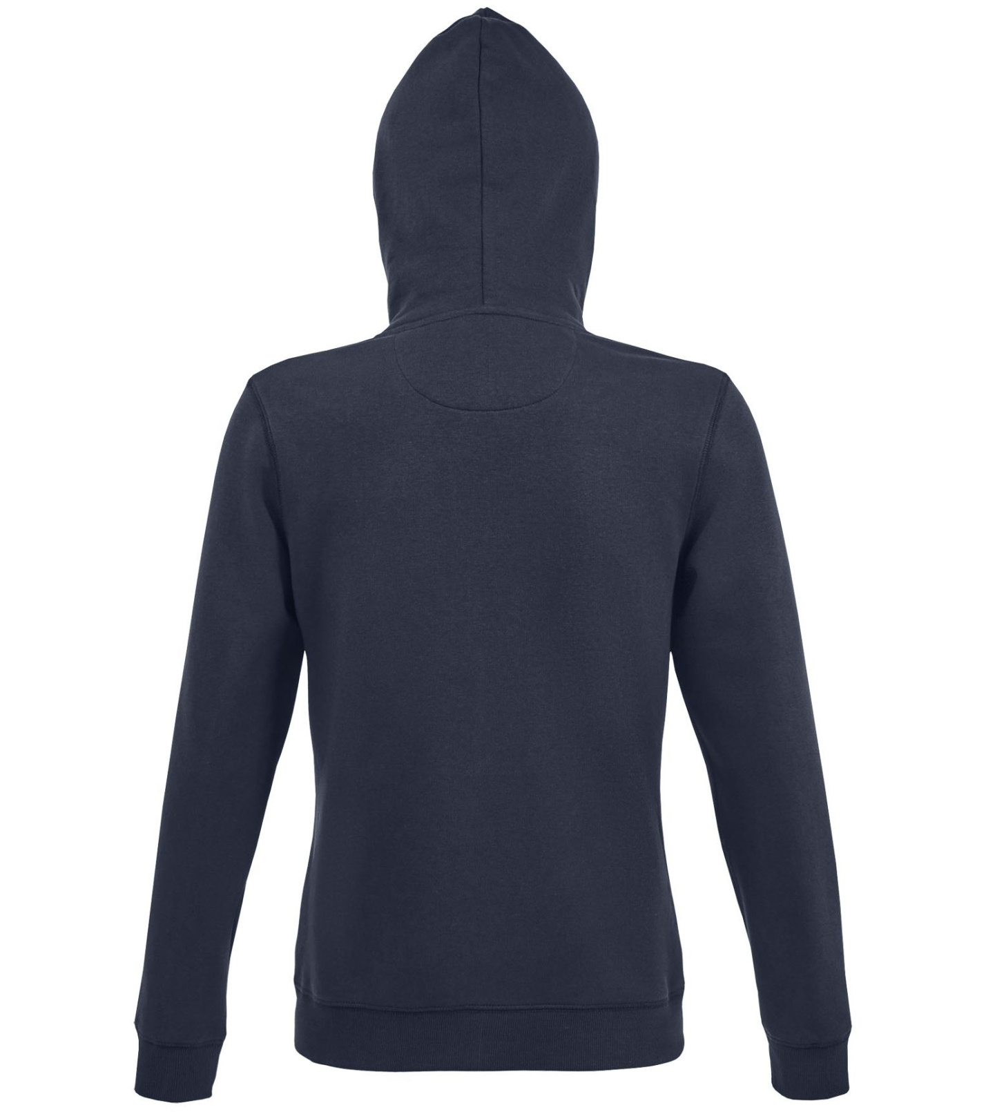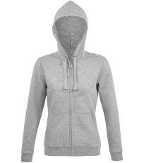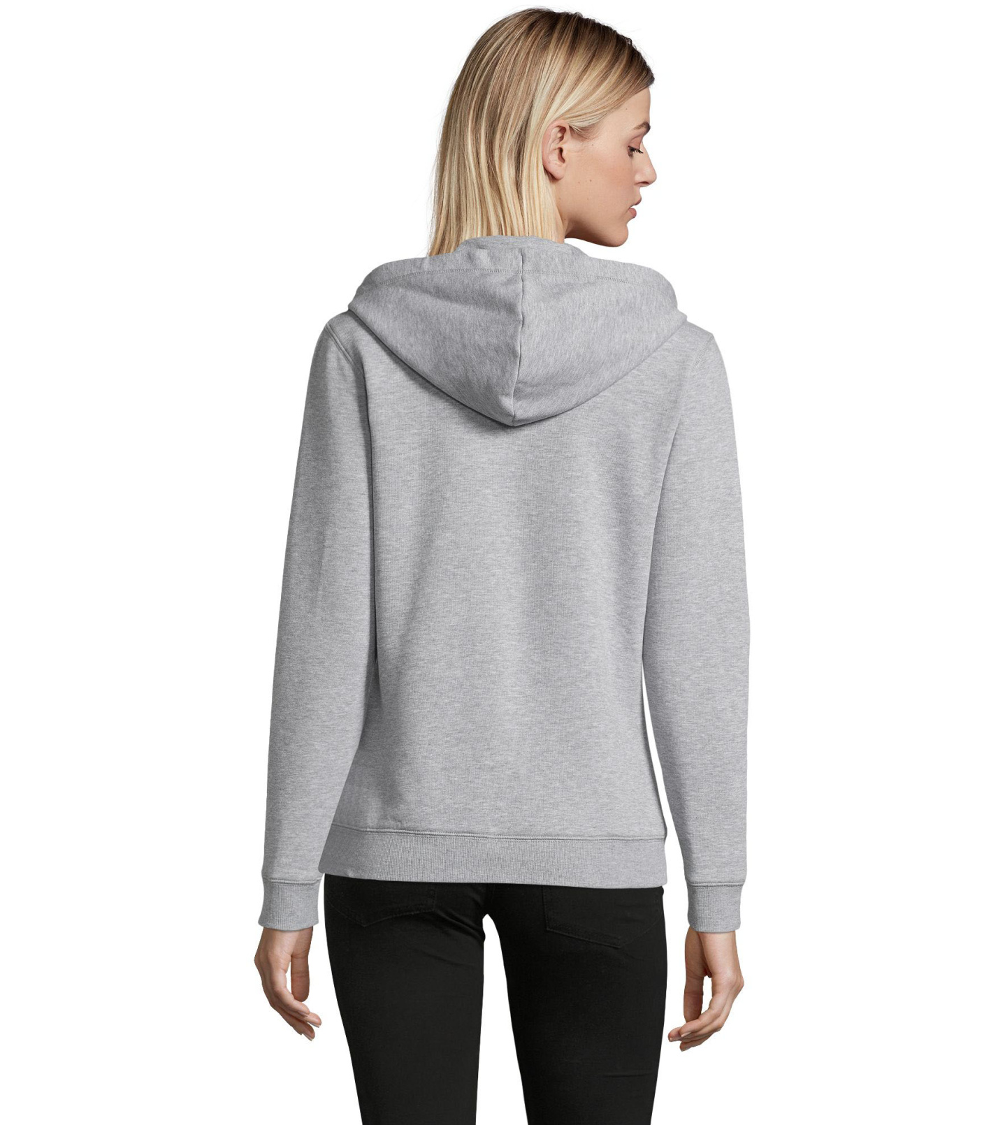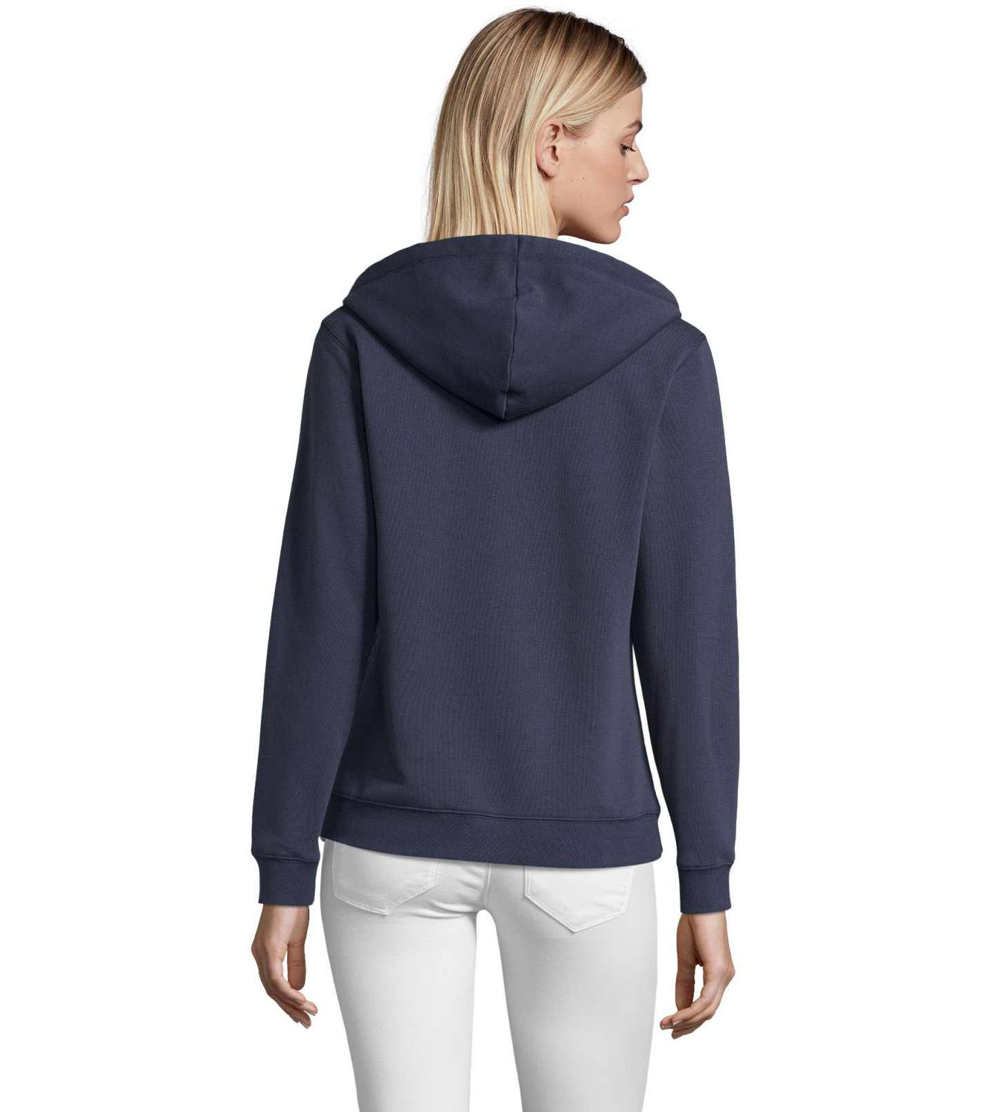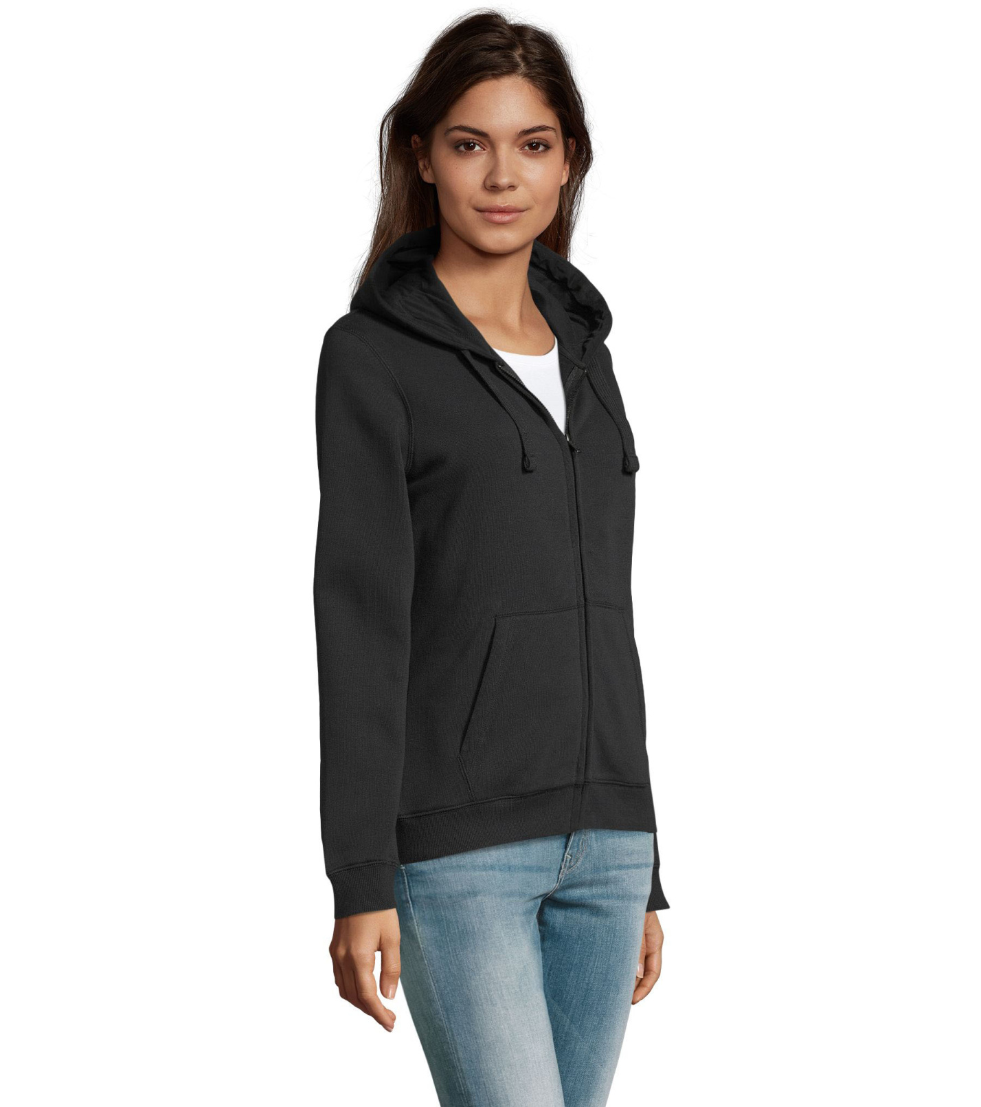 Damska bluza zapinana na zamek, z kapturem i bocznymi szwami. Z przodu znajdują się 2 kieszenie kangurki. Kaptur z podszewką i sznurkiem w kolorze materiału. Mankiety rękawów i dół bluzy wykonane są z dzianiny prążkowanej 2x2. Rękawy można regulować za pomocą mankietów. Od wewnętrznej strony wokół szyi wklejka w kształcie półksiężyca.