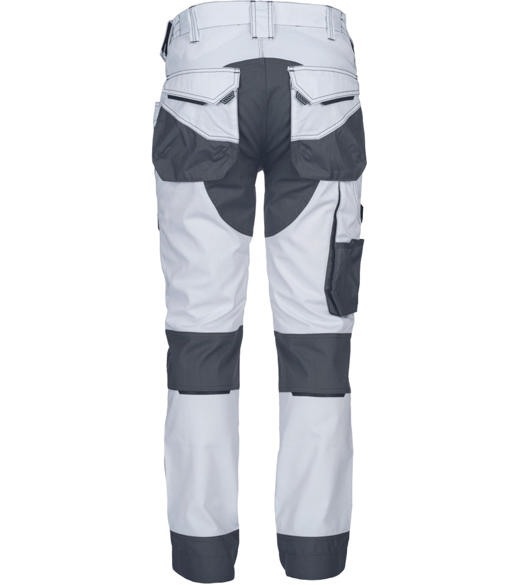 Opis: lady's working pants with elastic waist; elastic inovative fabric TRIFIBETEX; durable tripple stitching of legs and crotch; Oxford 600D reinforced knee parts with input for knee pads; spacious multifunctional front pockets with tool strap; reflective details; extendable length of legs.