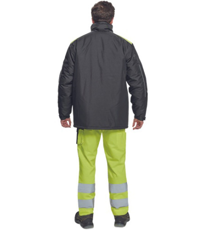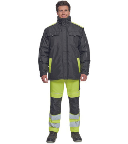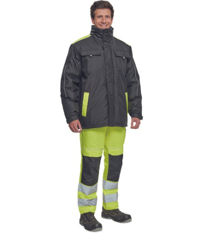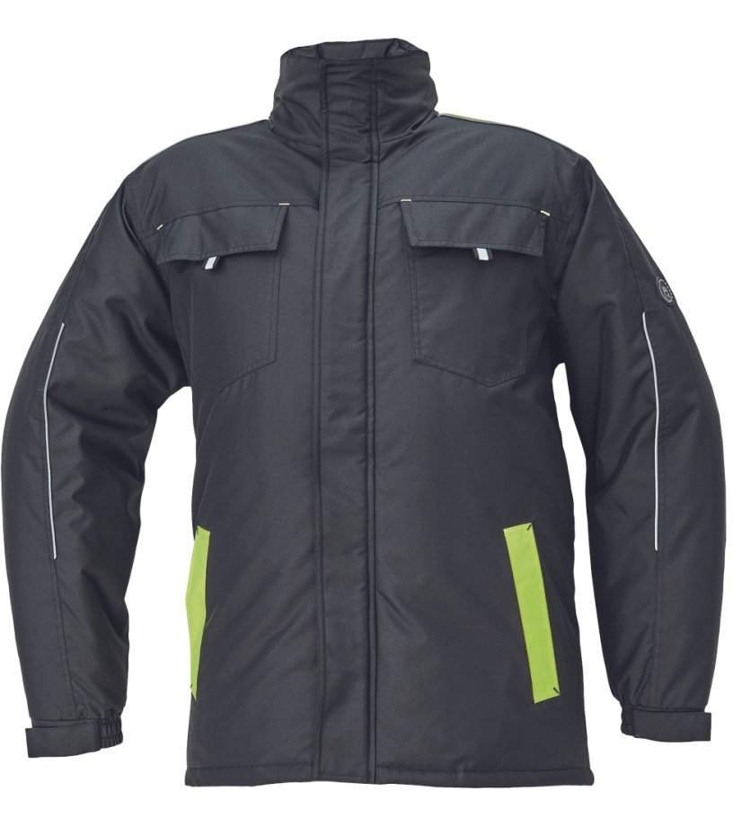 Opis: men´s winter parka; zipper closure covered by velcro flap; hood integrated in a collar; 2 side pockets, 2 chest pockets; 1 inner cell phone pocket; elastic cuffs with velcro adjustment; reflective elements.