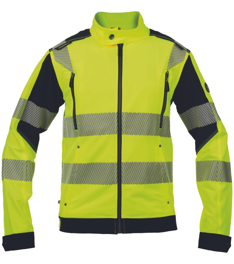 Opis: męska kurtka robocza HI-VIS ze stójką i zapięciem na suwak • elastyczny, innowacyjny materiał TRIFIBETEX VIS® • 2 kieszenie boczne • 2 kieszenie napiersiowe zapinane na suwak • wokół tułowia, rękawów i na ramionach znajdują się nadrukowane taśmy odblaskowe o szer. 7 cm • mankiety rękawów regulowane na rzepy