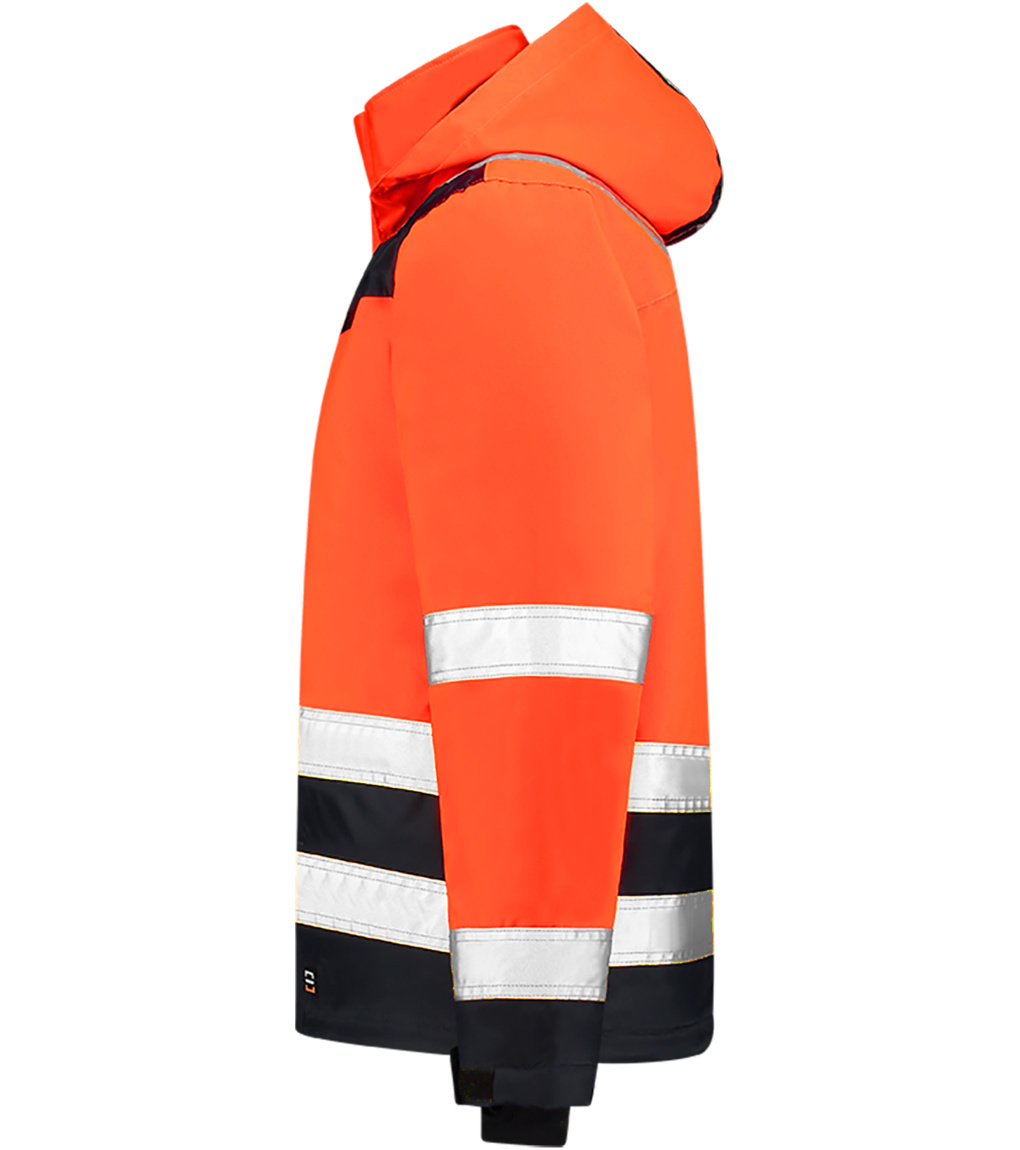 Kurtka robocza o wysokiej widoczności. Wodoodporna, wiatroszczelna i oddychająca, z odblaskowymi paskami i odpinanym kapturem. Zapinana na całej długości na zamek błyskawiczny z osłoną podbródka i patką. 2 przednie kieszenie zapinane na rzep i patkę.