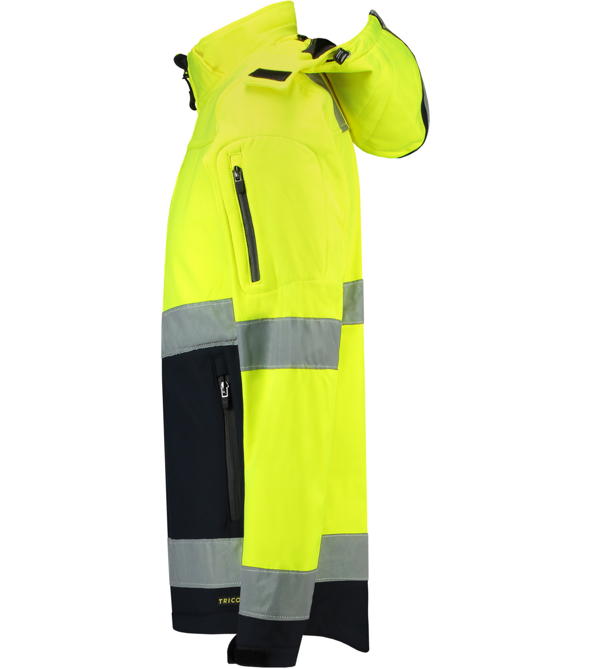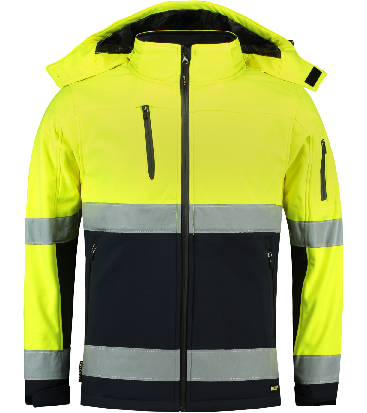 Kurtka softshell to odzież o wysokiej widoczności wykonana z wodoodpornego, wiatroszczelnego i oddychającego materiału. Posiada paski odblaskowe, odpinany kaptur, zamek błyskawiczny na całej długości z osłoną podbródka, kieszenie z odwróconym, spiralnym zamkiem błyskawicznym, kieszeń na piersi z wyjściem na słuchawki, regulowane mankiety na rzepy, profilowany i lekko przedłużony tył oraz dół z gumką.