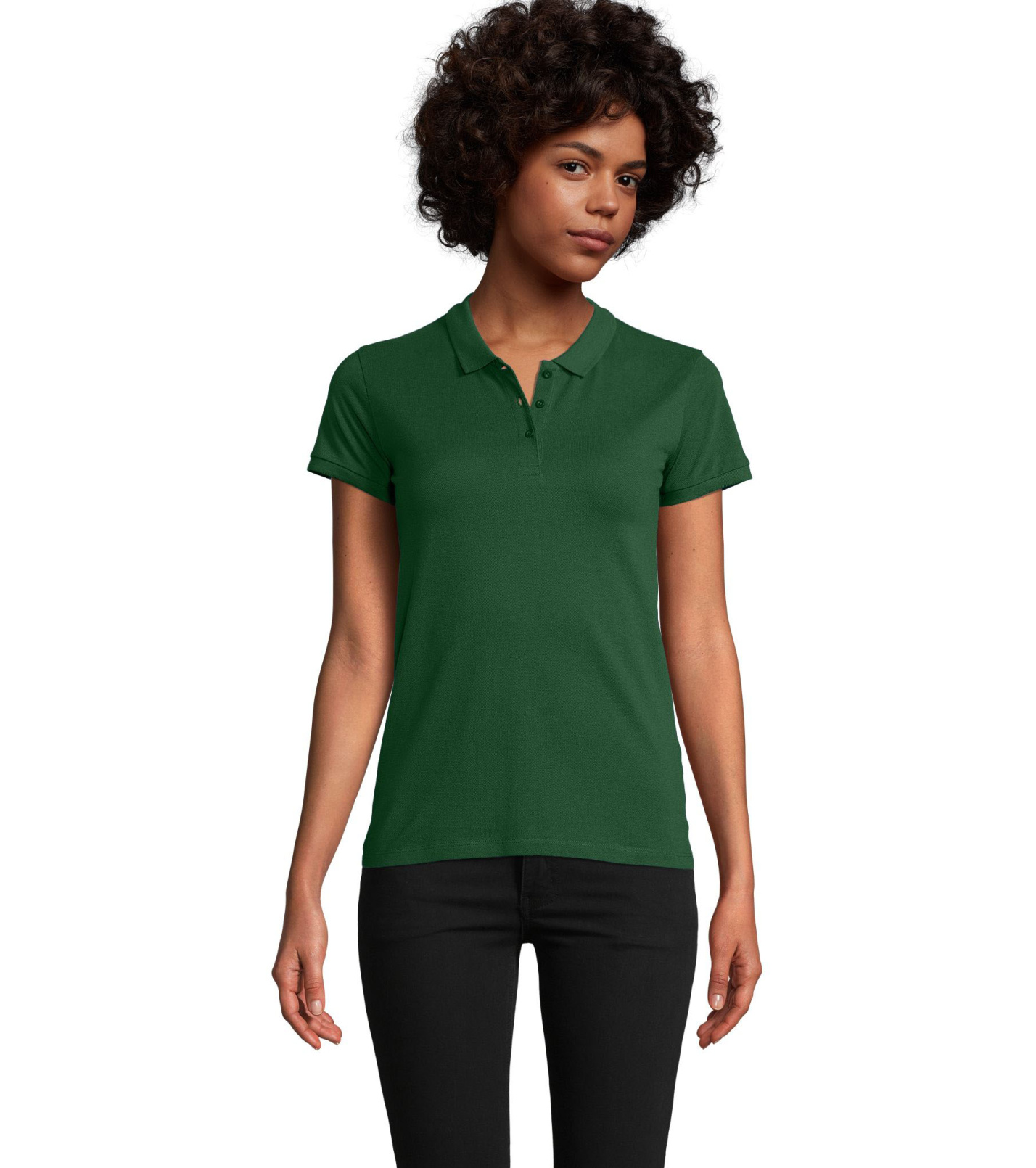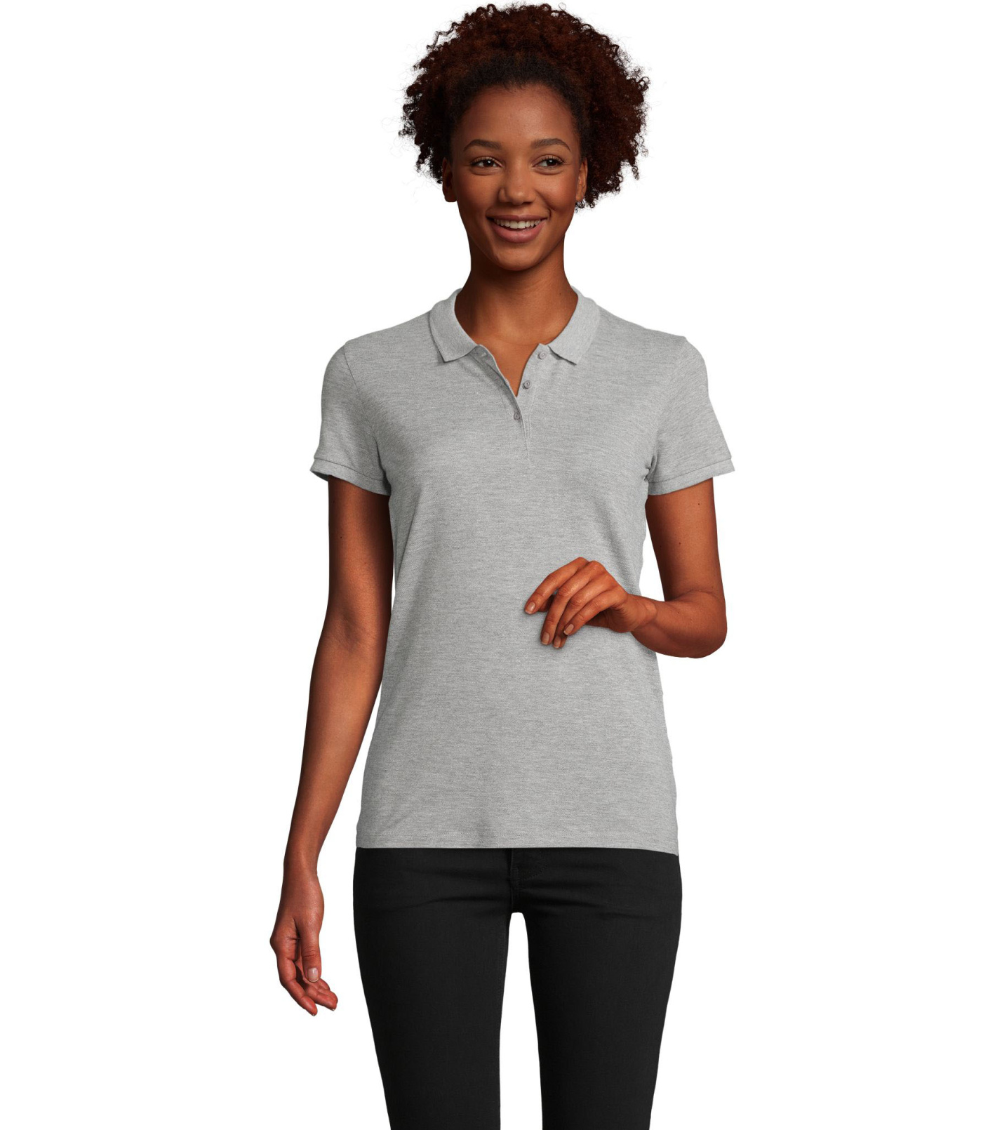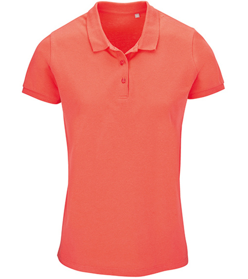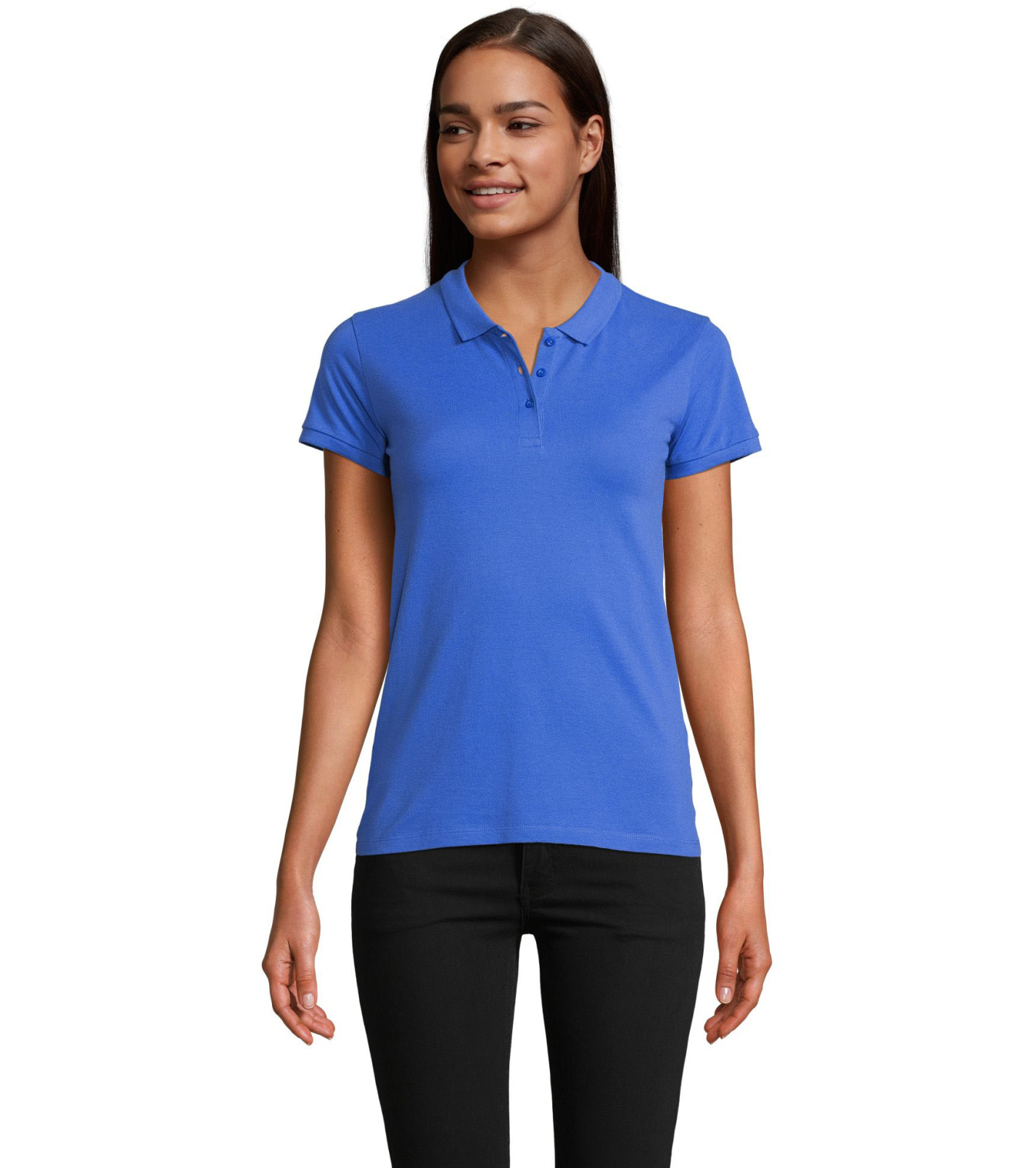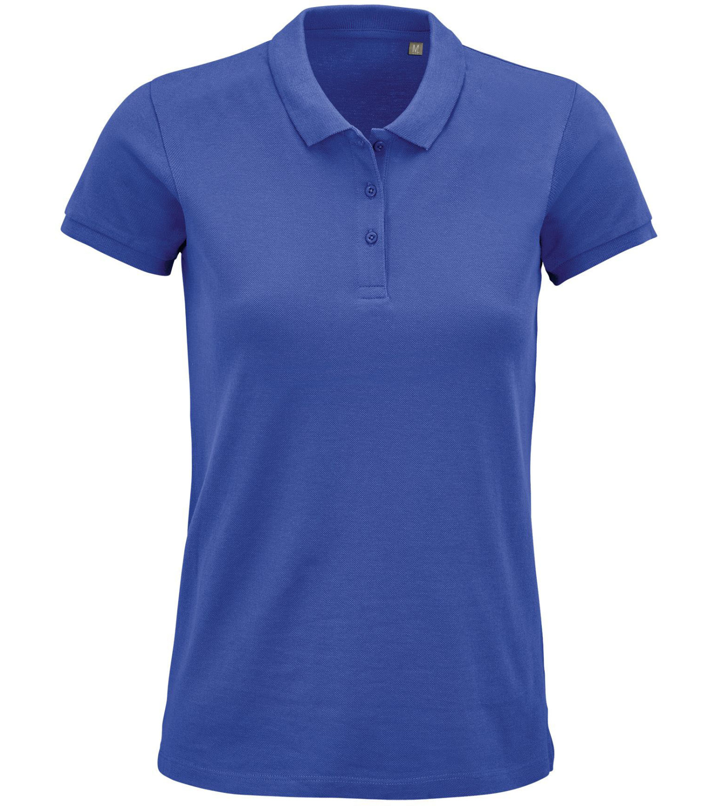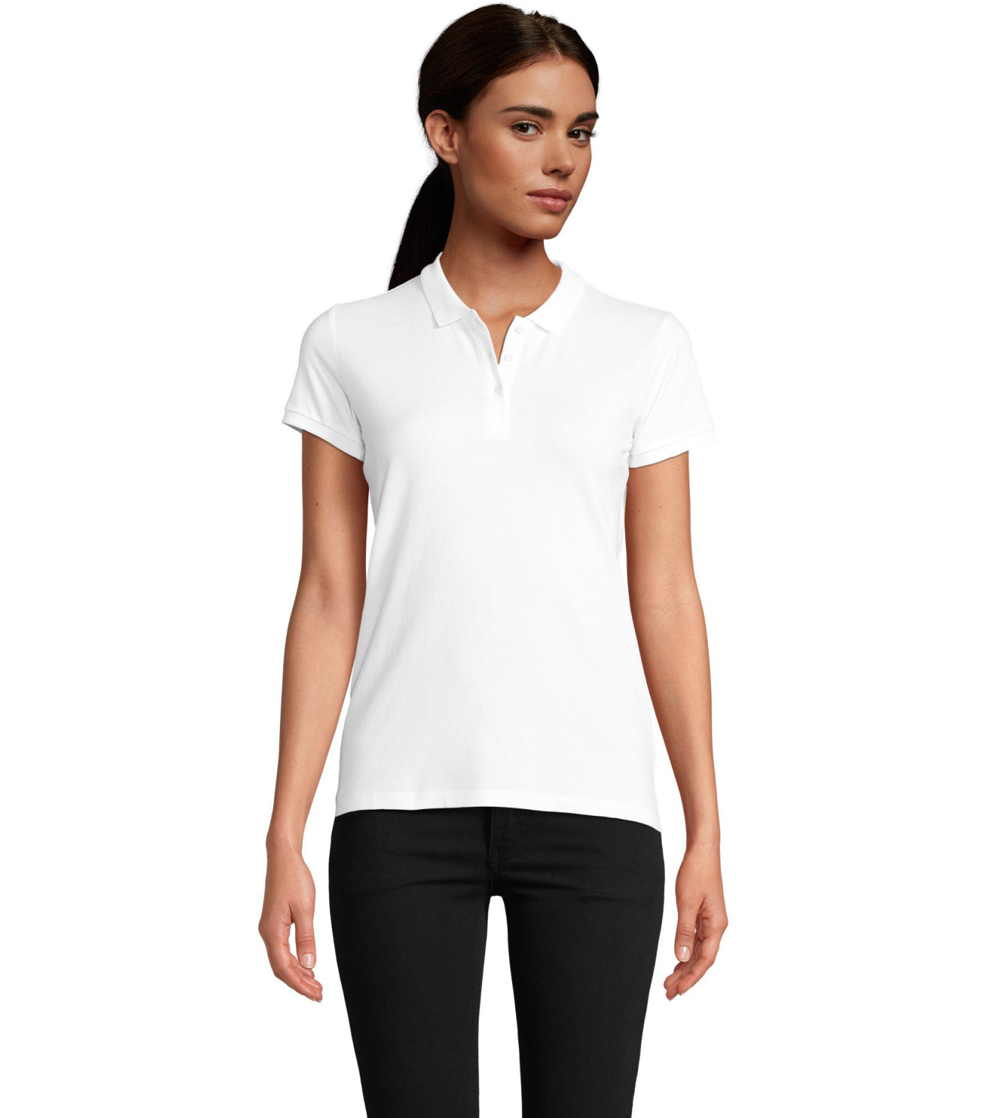 Damska koszulka polo z ekologicznej bawełny z krótkim rękawem. Prosty dół, boczne szwy i prążkowany kołnierz. Koszulka polo posiada trzy guziki w kolorze koszulki do zapięcia pod szyją oraz jeden zapasowy guzik w wewnętrznym szwie bocznym.