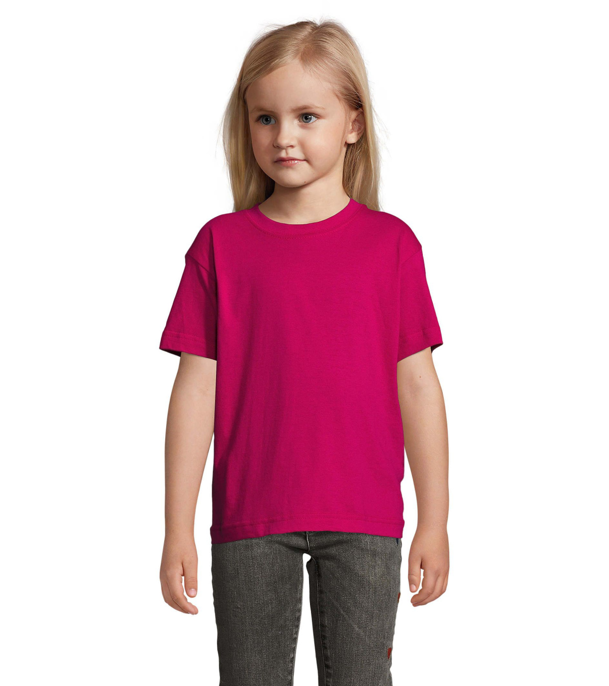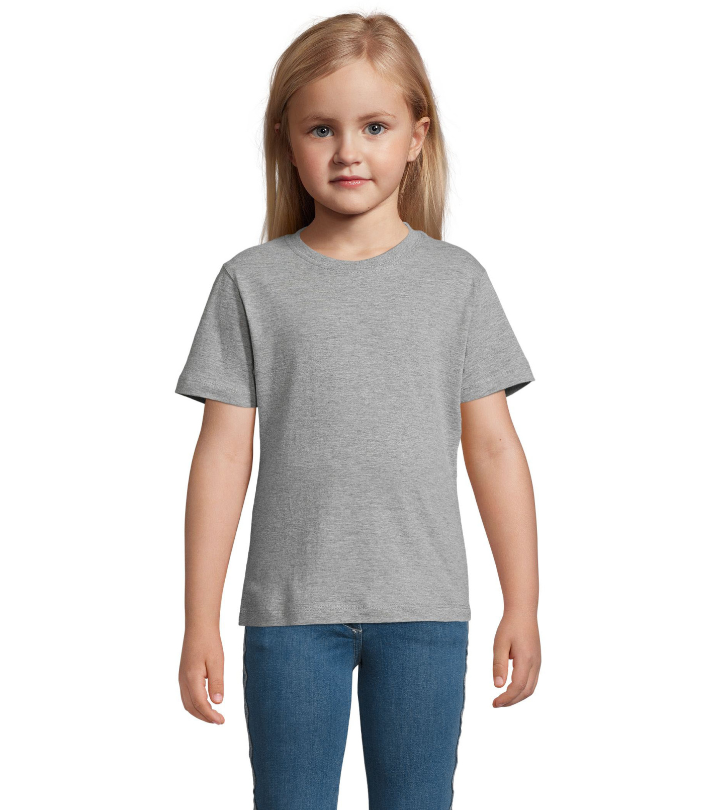 Bawełniany T-shirt dziecięcy z krótkim rękawem i okrągłym dekoltem. Dół kołnierza jest elastyczny.
